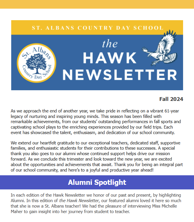 At the heart of St. Albans is its community and our former students remain a significant aspect of the school. The successes of today’s students are built on the achievements of our alumni. We like to share alumni updates on our website and in other publications such as Hawk Eye News and our bimonthly e-newsletter. To read the most recent copy of Hawk Eye News, click here.